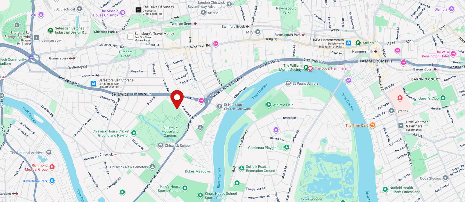 We are easily accessible from the M4 without entering the congestion charge area. There is parking in the Chiswick House public car park on a Pay and Display basis.